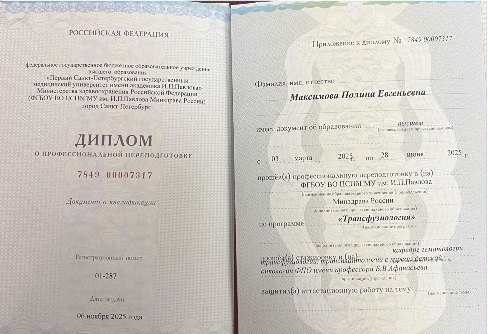 Я врач-гематолог, Максимова Полина Евгеньевна. Окончила ординатуру по гематологии в НИИ детской онкологии, гематологии и трансплантологии им. Р.М. Горбачёвой. В своей работе опираюсь на принципы доказательной медицины: не назначаю лишних обследований и не лечу без необходимости, а каждое решение принимаю на основе клинического мышления и актуальных данных.